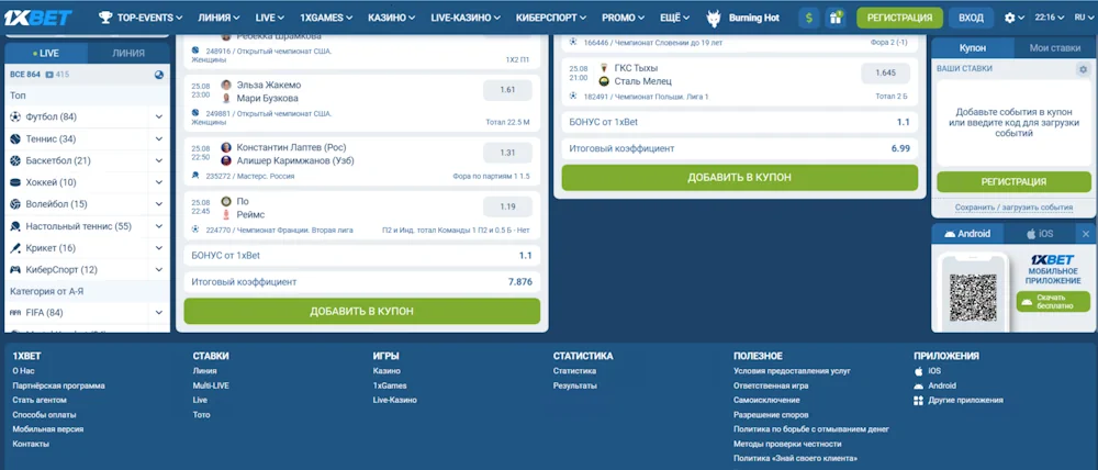 Онлайн-площадка 1xBet известна продуманным интерфейсом и удобной структурой. Официальный сайт выполнен в фирменных оттенках синего и белого цветов, что придаёт дизайну современный и лаконичный вид. Все разделы чётко распределены по категориям: «Спорт», «Live», «Казино», «Промо», «Слоты» и другие. Центральная часть главной страницы отведена под линию ставок с актуальными коэффициентами и прямыми эфирами матчей, а боковое меню позволяет быстро перейти к нужным турнирам и дисциплинам.